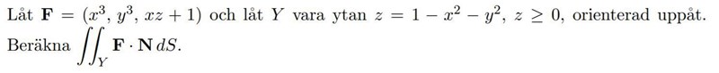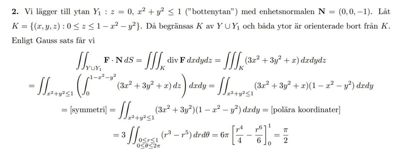 Poängen med att lägga till ytan är ju att vi vill få en sluten yta så att vi kan applicera Gauss sats. Originalytan Beskriver ju en paraboloid som pekar uppåt. För att sluta ytan lägger vi då till "botten" på vår paraboloid. Alltså en disk med radien 1 som ligger i -planet.