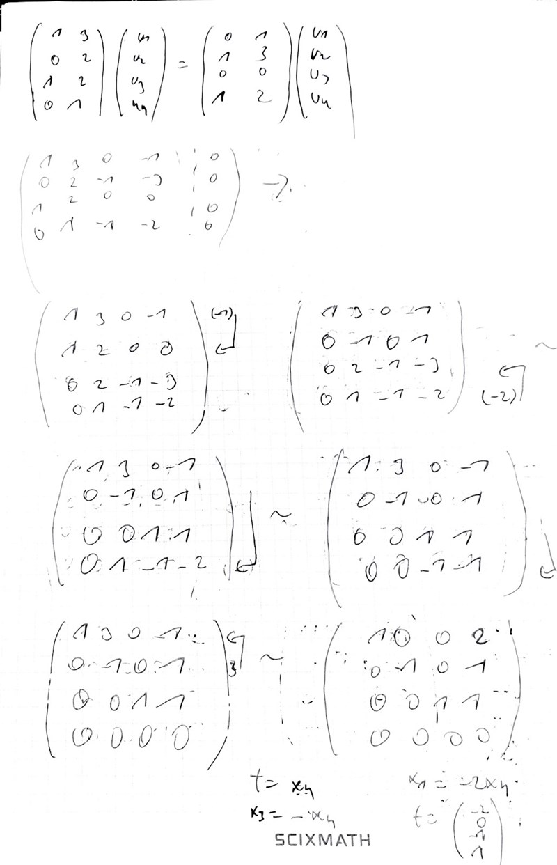 Notera minustecknen! Nu kan man för bekvämlighetens skull sätta minustecknet på kolonnerna, eller på och , men det spelar ingen roll eftersom koefficienterna är godtyckliga. Det viktiga är att du förstår vad vi får ut, nämligen hur kolonnerna måste förhålla sig till varandra för att vi ska kunna konstruera en vektor som ligger i både och samtidigt.