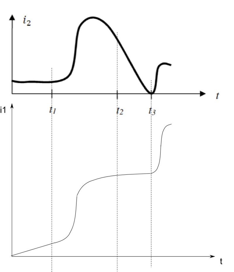 Är det för att i t3 är i2 minst därför i t3 är i2's kapacitet att motverkar den ökande flödet minst. Därför är i1 starkast i den punkten.
