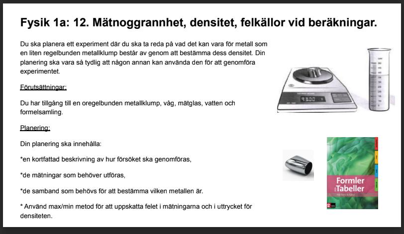 Amen rätt väl. Man tar reda på volymen genom att beräkna volymskillnaden på vattnet med eller utan metallklumpen i sig. Sedan väger man varje metall och beräknar sedan densiteten genom att dela massa med volym.