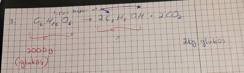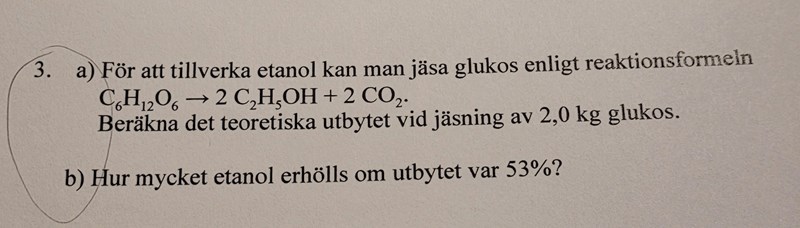 Jag behöver hjälp med a). Är det rätt att glukos är det jag markerat på bilden ovan? Det teoretiska utbytet är angivet i gram. Men det är inte 2000g i facit så jag antar att där jag satt frågetecknet är glukos?