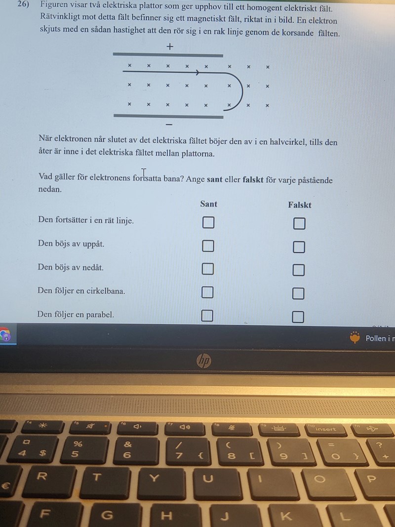 Jag har stött på följande uppgift och förstår inte teorin bakom den. Jag förstår varför elektronen rör sig i en cirkel ska utanför det elektriska fältet, men inte svaret. Jag tänker att det är alternativ 1 eftersom elektriska kraften är uppåt och magnetiska neråt (enligt högerhandsregeln), vilket ger en resulterandd kraft på 0. Men det är enbart om det är rätt spänning osv. Hur ska jag tänka?