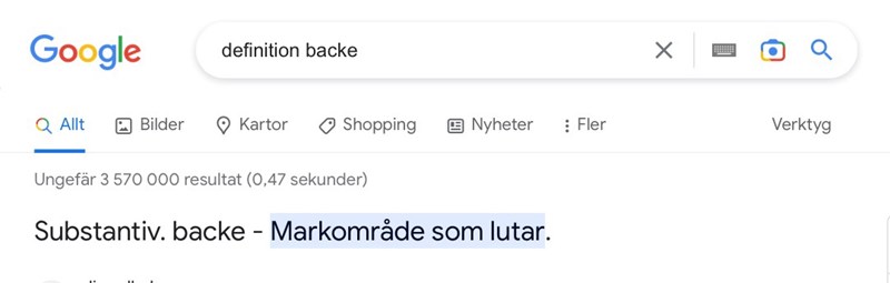 PATENTERAMERA skrev:Det är ju frågan om en backe. Så rimligen ligger alfa mellan 0 och 90˚. Troligen är lutningen dock betydligt mindre än 90˚. Den brantaste backen i Sverige lär vara 46˚.