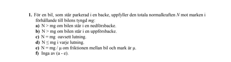 Jaha okej. Då är jag Med. Så det blir alltså d) eftersom N är alltid mindre än mg oavsett lutning?