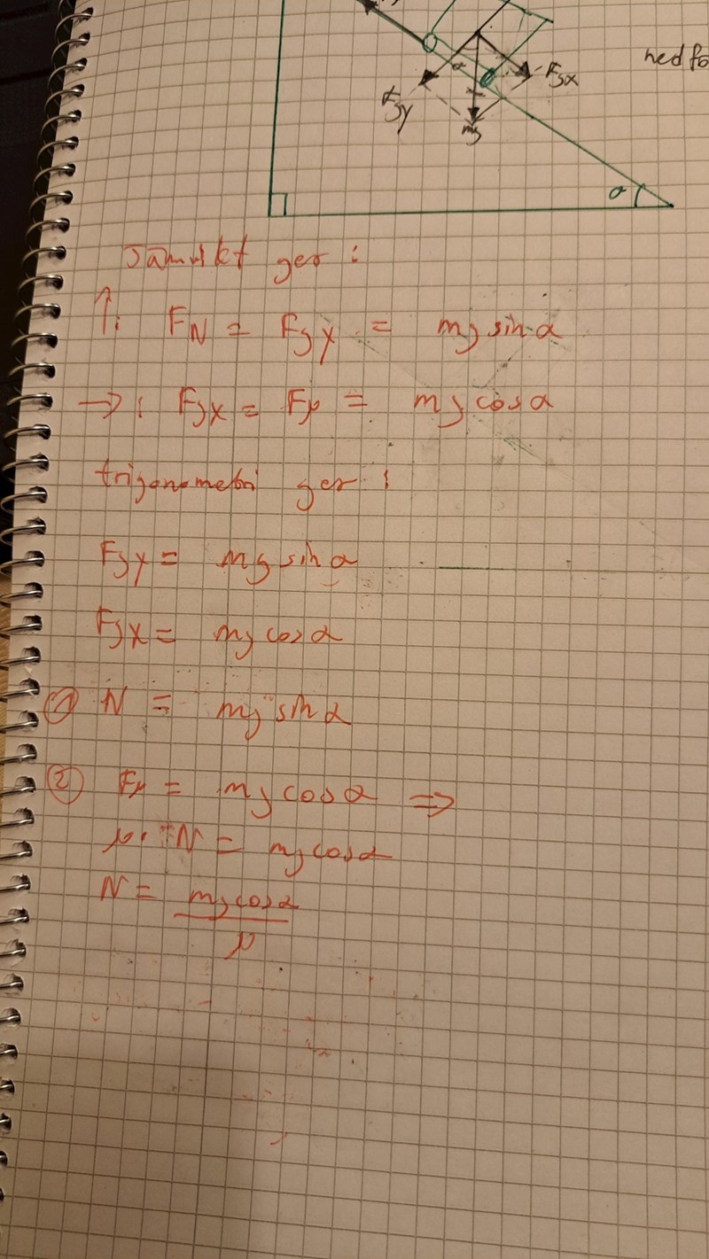 Hm okej. Jag tror jag gjorde fel på trigonometrin. Får typ Fn=mgcosalfa