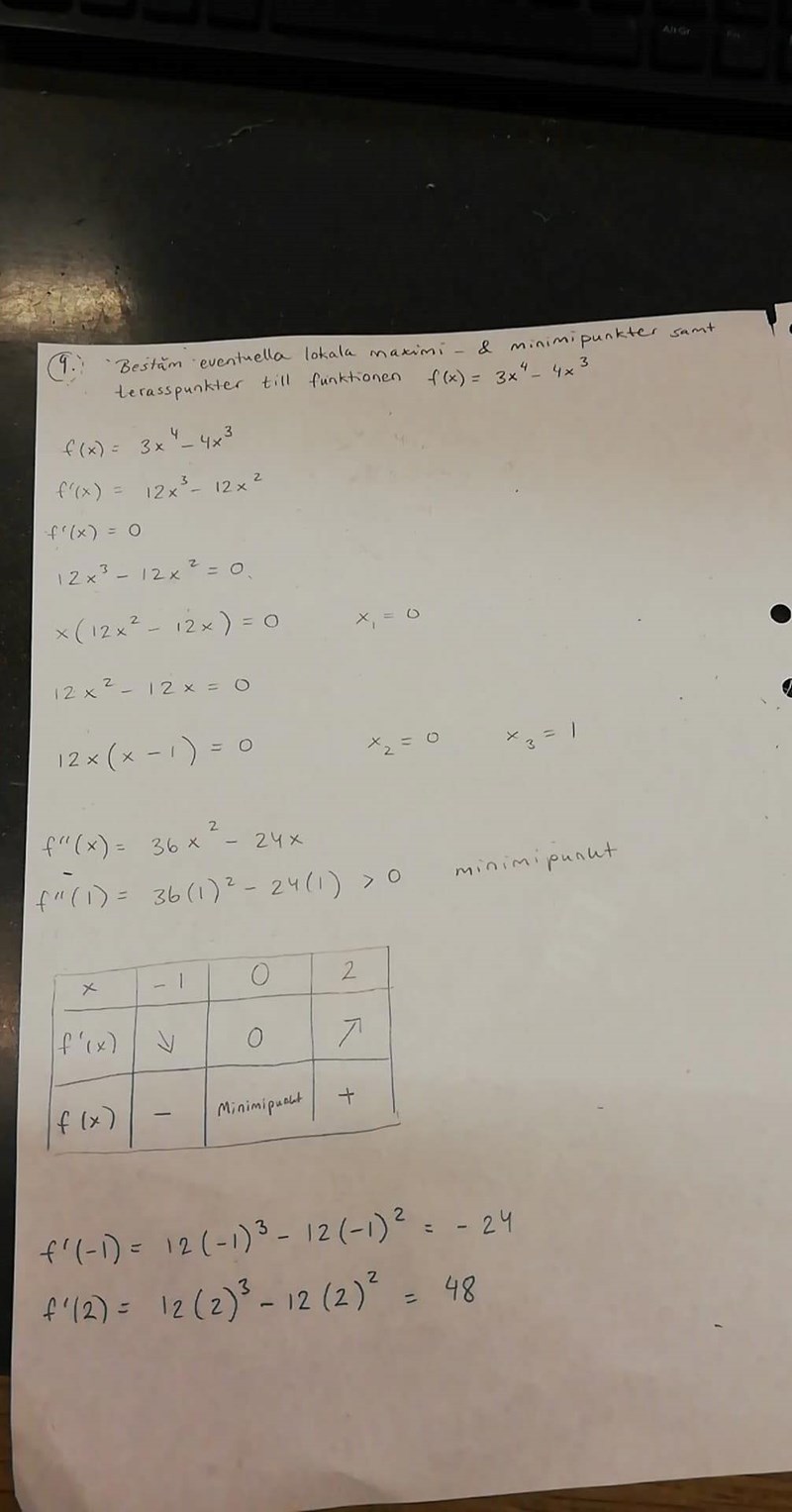I din teckentabell använder du värdena -1 0 2 och du har en minimipunkt vid x=1. Detta gör ju att funktionen har positiv derivata vid x=2. Prova ett värde som är mindre än nästa extrempunkt (i detta fallet x=1) men större än denna extrempukten (x=0)