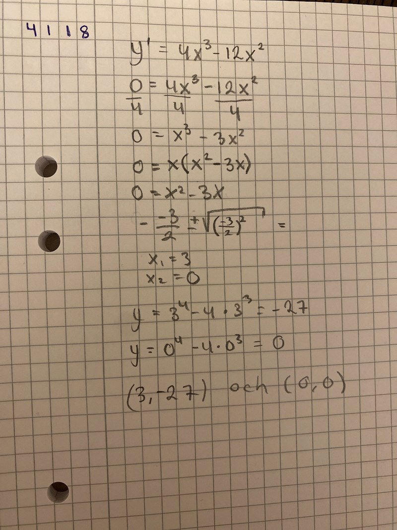Frågan: bestäm de lokala extrempunkterna och terrasspunktens koordinater för y=x4-4x3