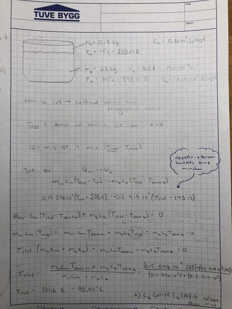 "BLand friluftsfolk är sk ståltermosar mycket populära eftersom de är stöttåliga, vi ska räkna på vad som händer när man häller upp kaffet från en sådan termos. Kaffemuggen (locket) väger 150 g och har temperaturen 15 grader celsius. Kaffet har temp. 75 grader C och man häller upp 200 g (ca2 dl). Försumma värmeutbytet med omgivningen och beräkna kaffets temp vid termisk jvt. Stål har c = 0,46 kJ/kgK och sätt att c kaffe = c vatten.