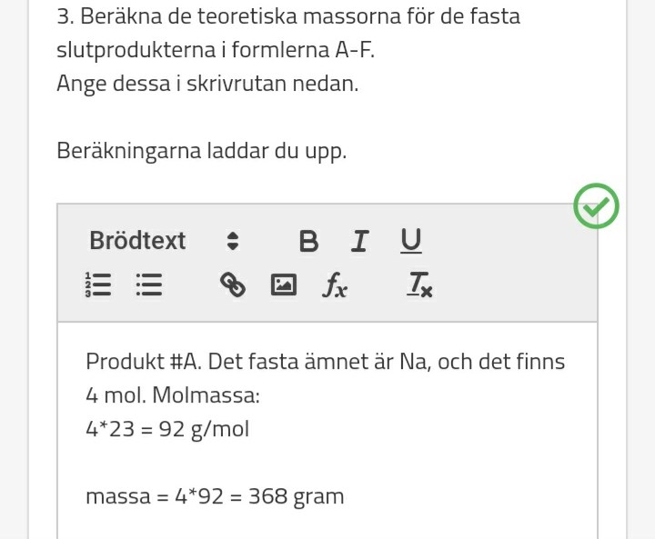 Jag har räknat ut på samma sätt alla produkter och alla reaktanter, och svaren blev :