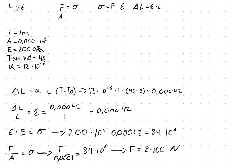 Jag tänker att jag möjligen kan räkna ut töjningen med hjälp av längden och längdförändringen. Via töjningen multiplicerat med E så får jag spänningen, spänningen multiplicerat med arean bör väl ge kraften fast det blir fel för mig.