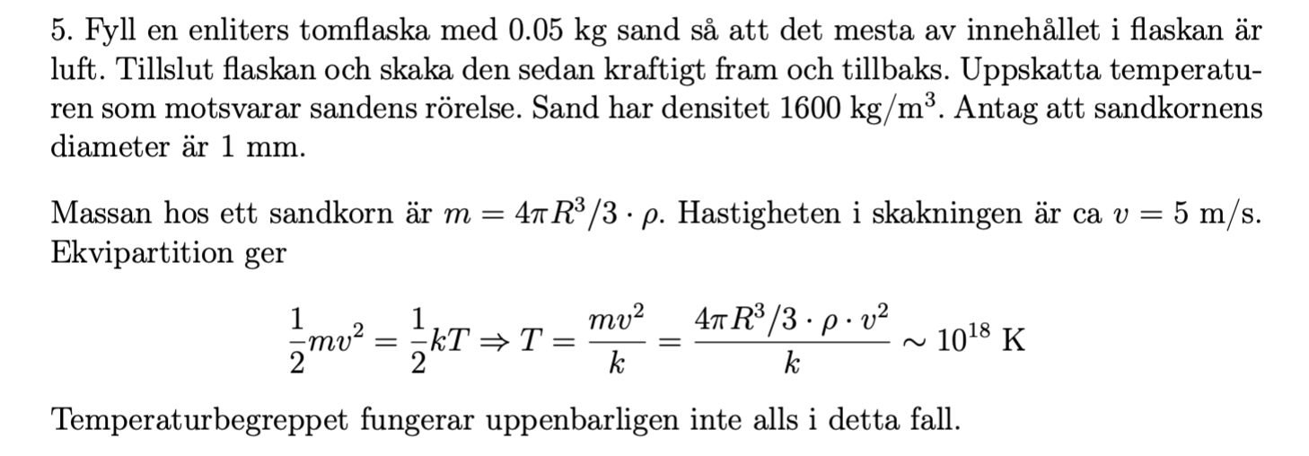 detta är uppgiftens facit. Jag fattar att man antar att sandkornen beter sig som en monoatomär ideal gas, och att medelenergin för varje sandkorn därför blir den kinetiska energin. Dock säger facit sedan att den kinetiska energin ska bli lika med (1/2)kT, inte (3/2)kT. Är detta för att frågan säger att man bara skakar sandkornen fram och tillbaka, och att de därför bara har en frihetsgrad? jag ville bara fråga för att säkerställa att jag tänkt rätt.