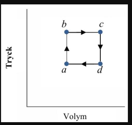 Figuren visar en kretsprocess som genomgås av acetylen-gas som kan betraktas som ideal. I processerna ab och bc tillförs värme medan det bortförs värme i processerna cd och da. Trycket i a är pa, trycket i c är 2,08·pa, volymen i a är Va och volymen i c är 2,2·Va.
