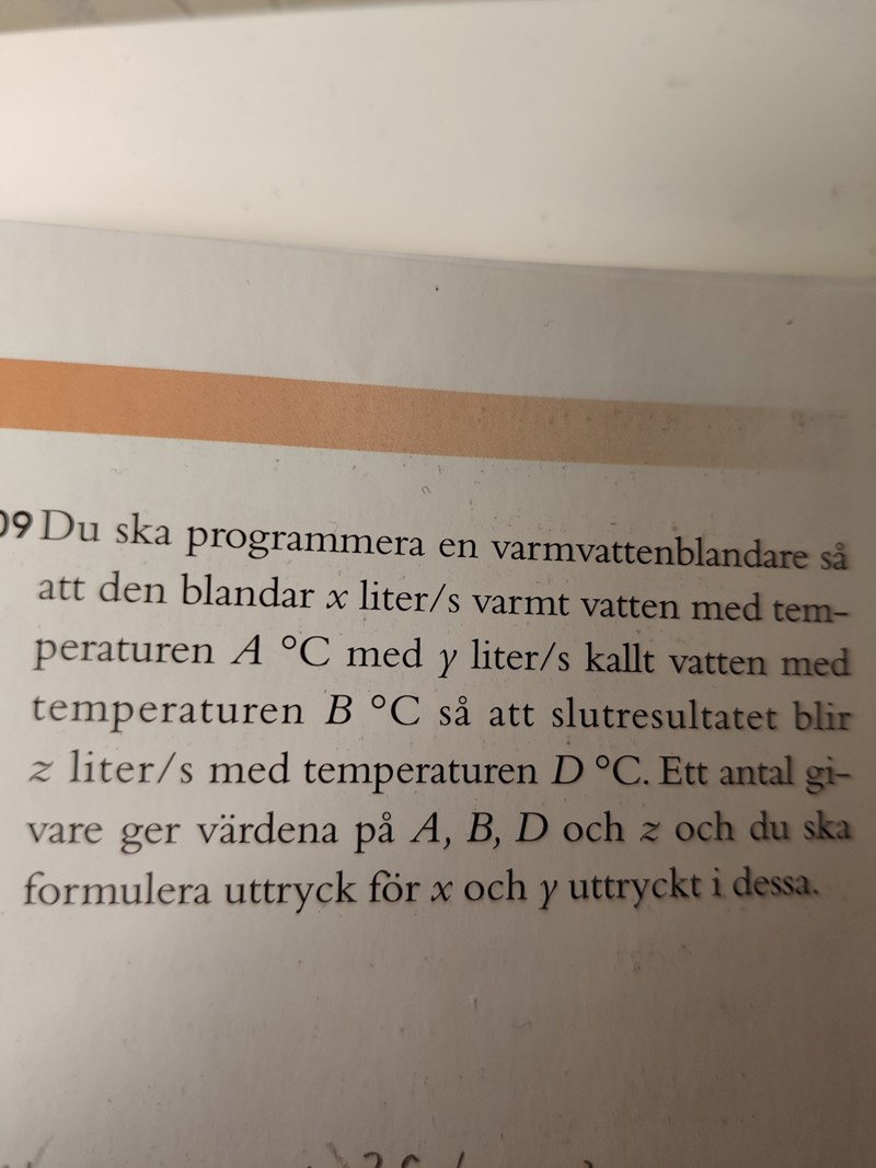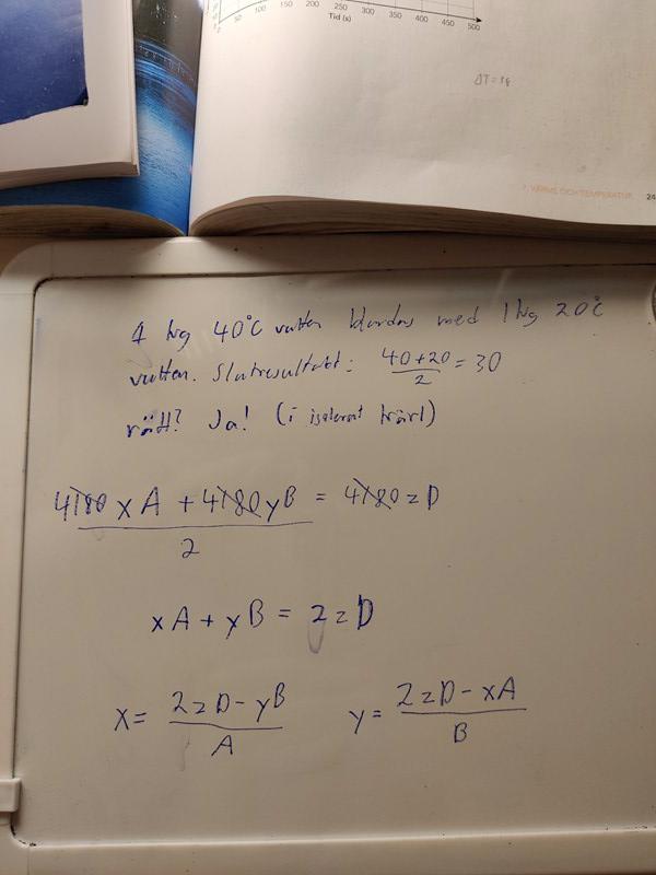 In: x liter vatten med temperaturen A och y liter vatten med temperaturen B, A > B.