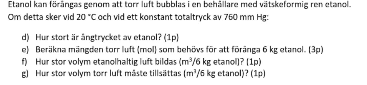 Då är det ungefär 6 % (43,85/760) etanol i luften, när den är mättad. Detta är mol-%. Förmodligen var det någon tidigare uppgift som gav mer lättanvända siffror, d v s det var nog ett annat svar än just d som behövdes.