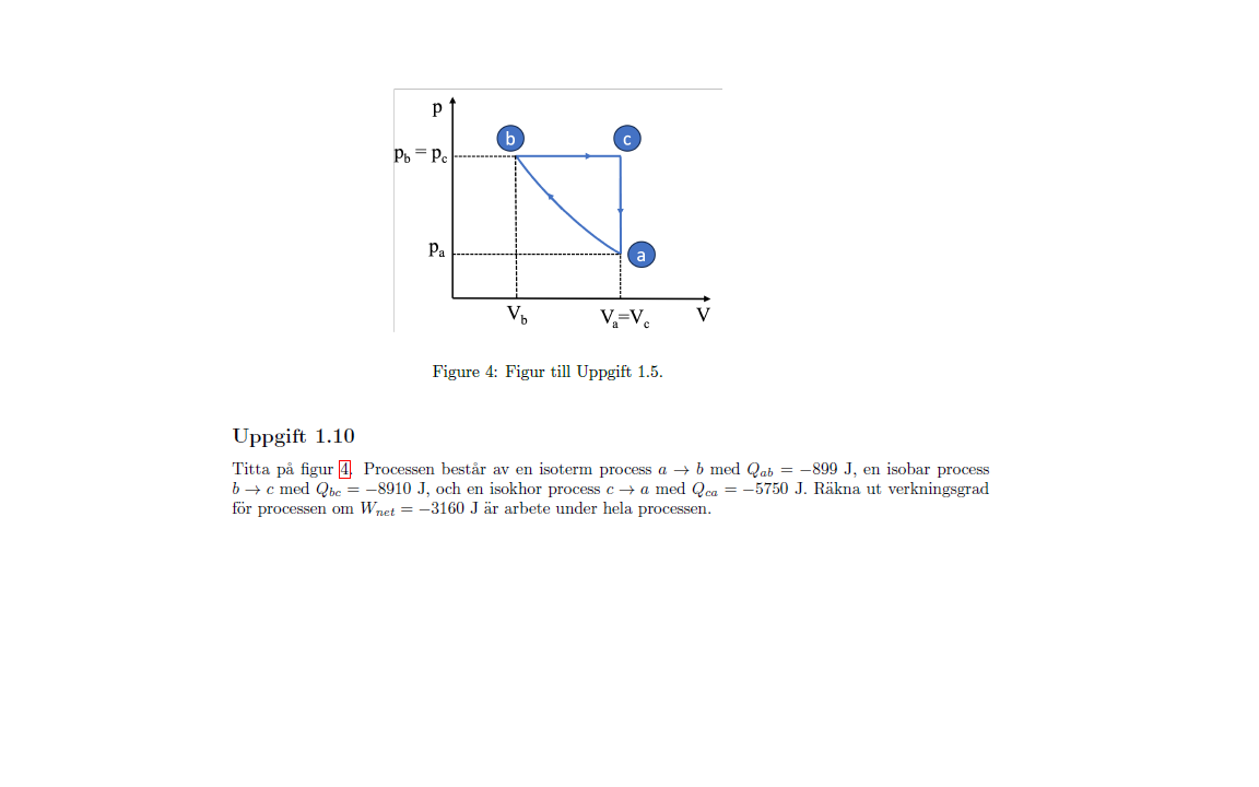 Vi får angivet att Q_{ab} = -899 J Q_{bc} = -8910 J Q_{ca} = -5750 J