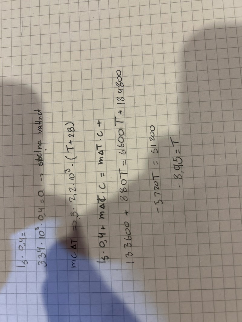 När 0,4 kg vatten fryser till is frigörs ... När 0,4 kg is kallnar från 0 oC till temperaturen T frigörs ..