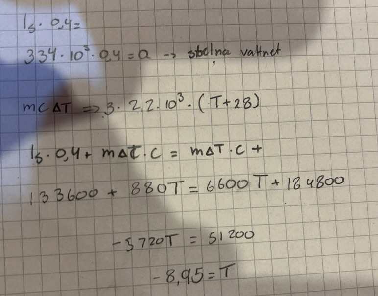 Från början: 3 kg is, -28 oC. 0,400 kg vatten, 0 oC.