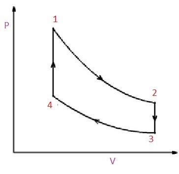 4–>1 motsvarar en isokor (konstant volym) upphettning där temperaturen och trycket stiger.