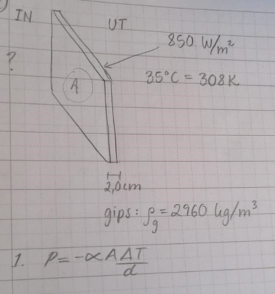Solen lyser på en yttervägg med effekten 850 W/m2. Väggen består av en 2cm tjock gipsskiva och yttertemperaturen mäts upp till 35C. Vad blir väggens innertemperatur om du antar att 25% av all energi absorberas av väggen? Hur tjock skall väggen göras för att innertemperaturen inte skall överstiga 18C