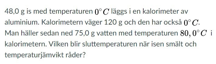 E(vatten 75g, 80Co -T) = E(is 48g att smälta) + E(vatten 48g, T - 0Co ) + E(Al 120g, T - 0Co)