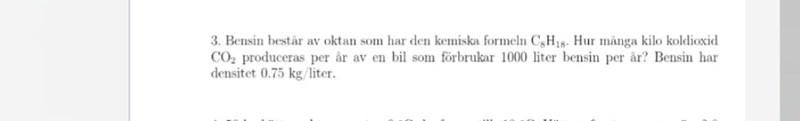 jag började alltså räkna ut massan per år dvs 1000 l/år×0.75 *10^3 g/l =75000 g/år. Sen räknade jag ut molekylmassa för bensin och fick ut substansmängden för bensin. Jag vet att molekylmassa för CO2=44 g/mol och då får man ju ut massan kilo för CO2 när man multiplicerar med substansmängden för bensinen. Facits svar 2,3 ton , men jag fick 2,9 ton. Vad är fel här?
