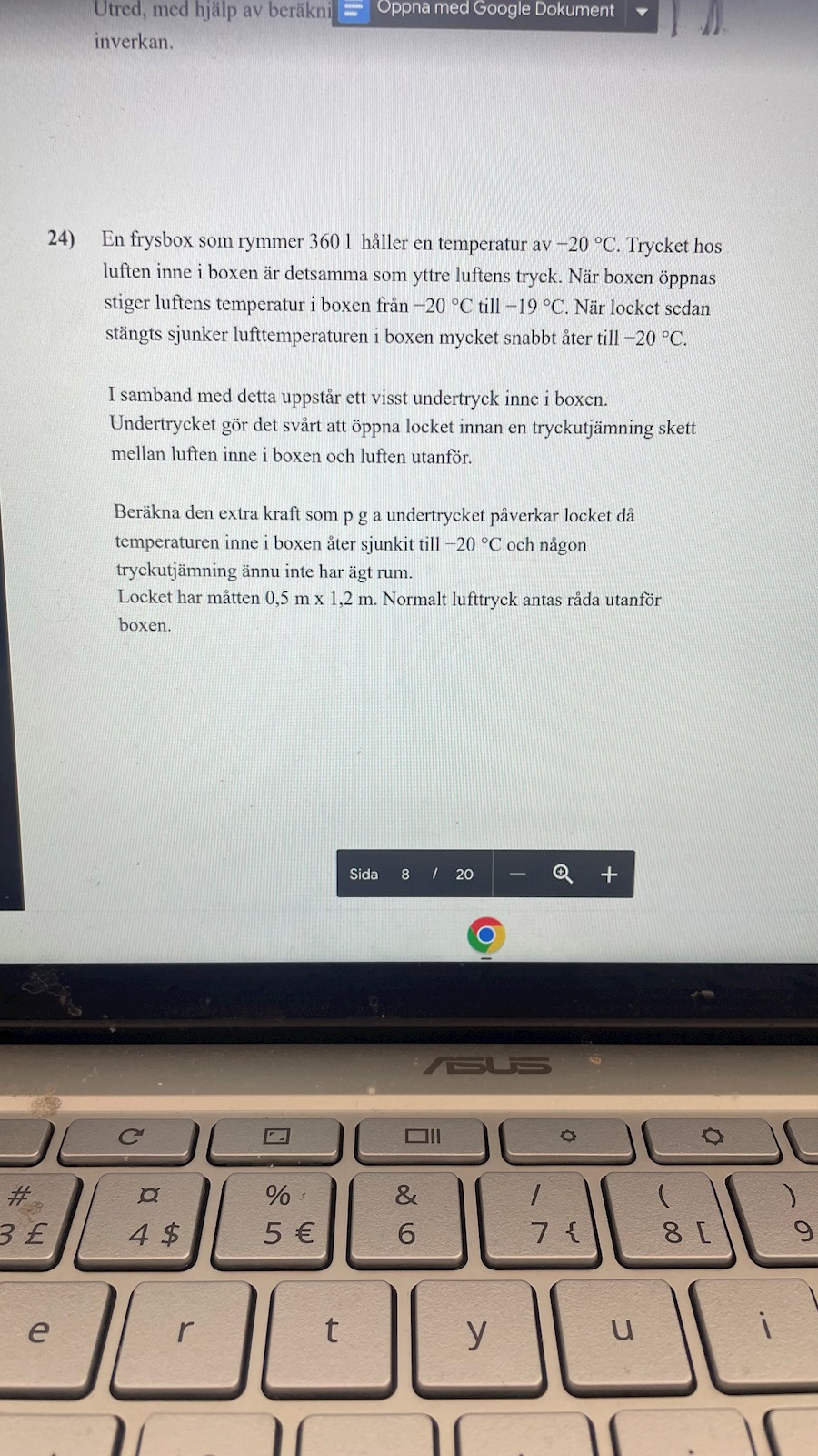 De flesta värden du behöver finns i uppgiften, men du behöver slå upp t ex värdet på R (eller vad fysikerna använder istället) och vad "normalt lufttryck" är. Du kan anta att substansmängden luft i frysboxen inte ändras. Använd idealgaslagen PV = nRT för att beräkna n när temperaturen är -19 oC, och använd detta värde för att beräkna trycket när temperaturen gått ner till -20 oC.