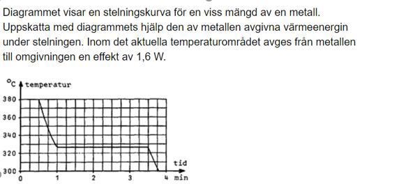 Jag har försökt lösa uppgiften nedan. Jag försökte först med att använda Q=P*t eftersom effekten är konstant och får svaret till 0,36 kJ när svaret ska vara 0,24 kJ. Hur ska jag dra nytta utav denna temperatur/tid graf med formeln Q=cmT när jag dessutom saknar massan och inte vet ämnets specifika värmekapacitet.