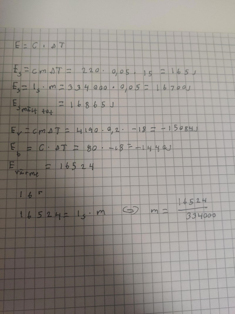 Avgiven värme när vatten + bägare svalnar från 18oC till temperaturen T = upptagen värme när isen värmst från -15oC till 0oC, när isen smälter och när smältvattnet värms från 0oC till temperaturen T.