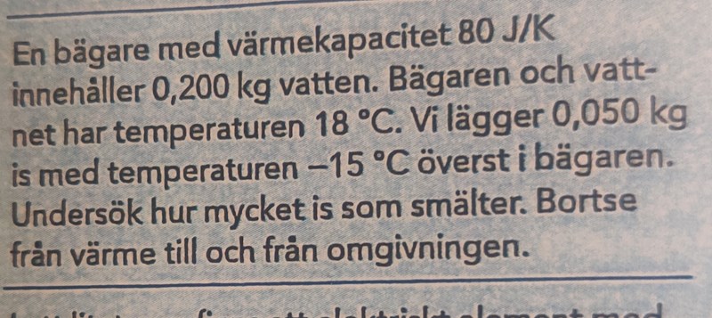 Aha så man kan anta i uppgiften att bägaren och vattnet släpper ifrån sig all sin energi så att de får en sluttemperatur på 0 grader?