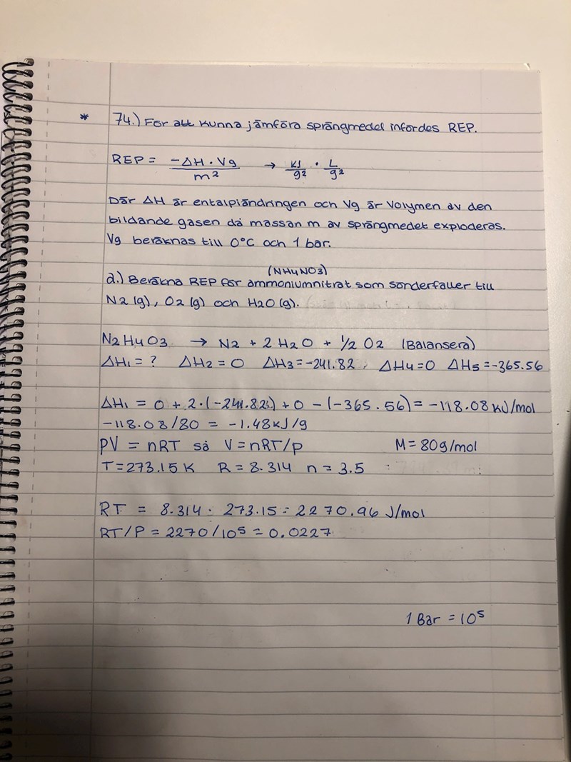 a) ammoniumnitrat som sönderfaller till N2 (g), O2 (g) och H2O (g) ”