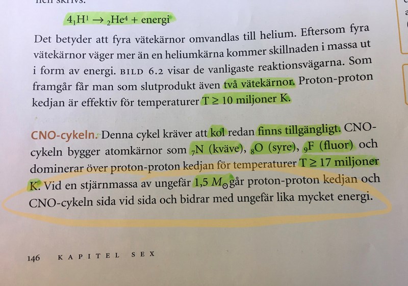 Så för att genomgå CNO-cykeln behövs kol närvarande som katalysator och en temperatur över 17*10^6 K.