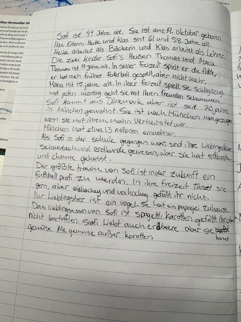 "Als Sofi noch zur Schule ging, waren ihre Lieblingsfächer Schwedisch und Erkunde, und sie hat Erkunde (?) und Chemie gehasst"