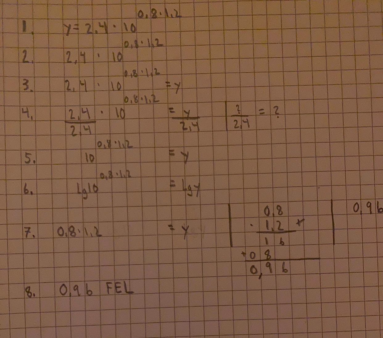 Jag tänkte att ekvationen: y= 2,4 * 10 ^0,8 * 1,2. ger mig y värdet som då är vikten. Men får fram ett y värde som inte kan stämma. Jag är något osäker på vissa steg i räkningen så kanske är det därför jag får fram fel svar, eller så har jag missuppfattat text uppgiften. Osäker på vilket det är, men så här räkna jag för att försöka få fram y (kg) värdet när x (m) är 1,2.