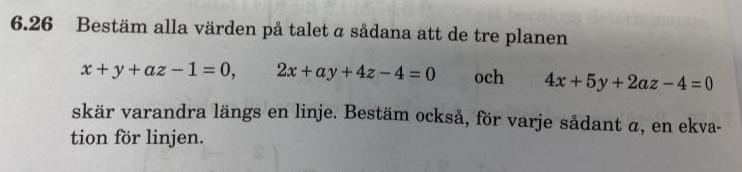 Jag tycker den var svår. För att de tre planen ska skära varandra längs en linje borde väl två av planen vara identiska. Men jag kan inte få ihop det. Närmast kommer jag med de två första planen.
