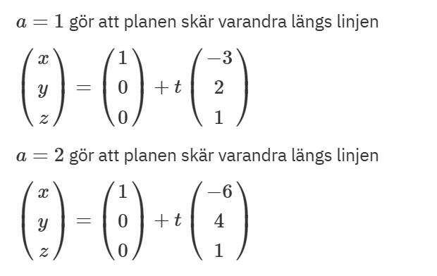Den här stämmer överens med facit. Hur har du kommit fram till detta? Där a=1 och a=2 varför är det just i dessa två fallet tre planen skär varandra längs en linje?