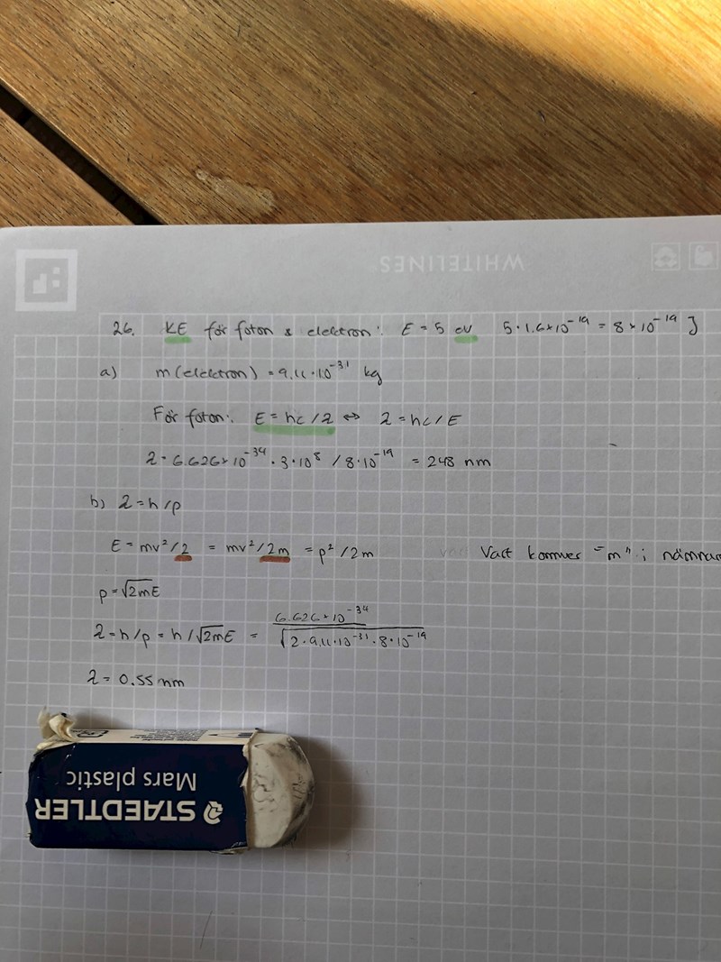 Detta är en uppgift som består av en a och b del. a delen hänger jag med på så den går att ignorera. Dock har jag med en omvandling av den kinetiska energin där om ni undrar varför jag får de värden som jag får.