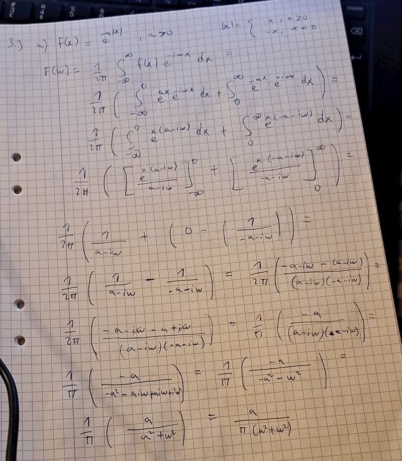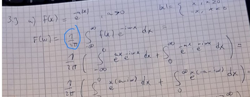En annan sak som stör mig här är när man skriver e^-a|x| eller e^-a|w|. För jag började med att hitta fouriertransformen till e^-a|x| och ej e^-a|w|.