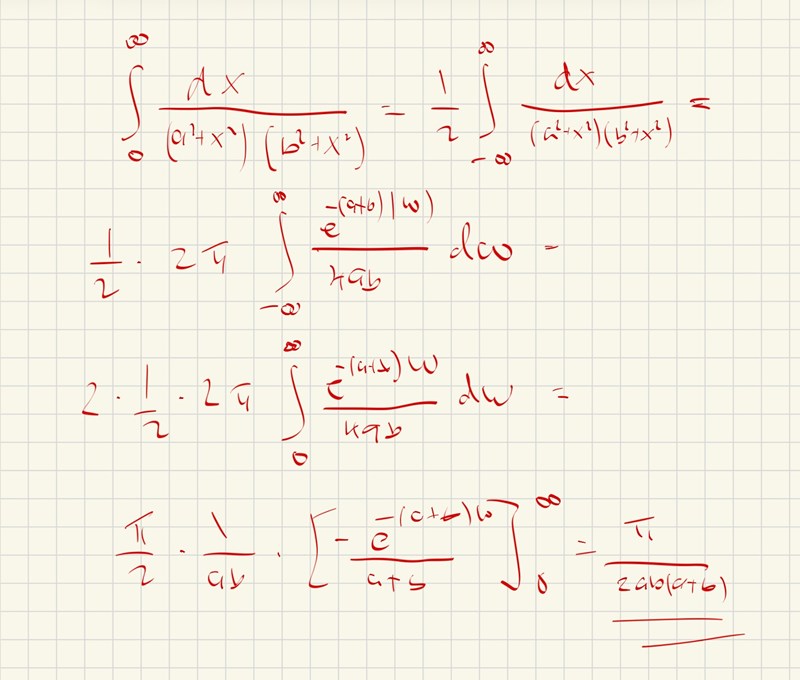Trinity2 skrev:destiny99 skrev:Trinity2 skrev:Jag vet ej om du har svaret men integralen är π/2 * 1 / (ab(a+b)) vilket ges genom part.uppdelning.