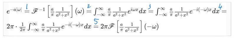 (1) är jag med på för det är sant att inversen av a/pi*1/(a^2+x^2) blir e^-a|w|. Sen är jag med på 2) , men inte 3)-5)