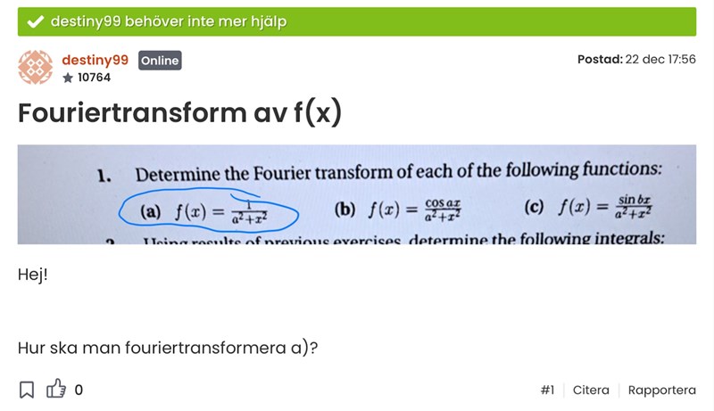 Jo men du skulle räkna ut F[1/(a2 + x2)](w). Hur gör du det?