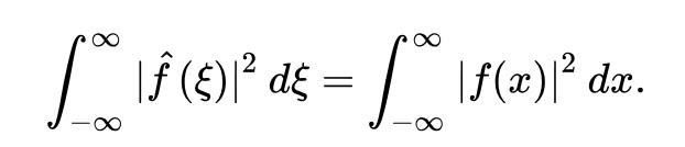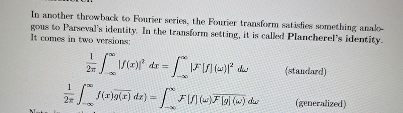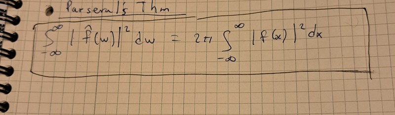 Efter det så utnyttjar vi Plancherels formel för att skriva om integralen som en integral över Fouriertransformerna i stället. 2pi kommer från Plancherels formel.
