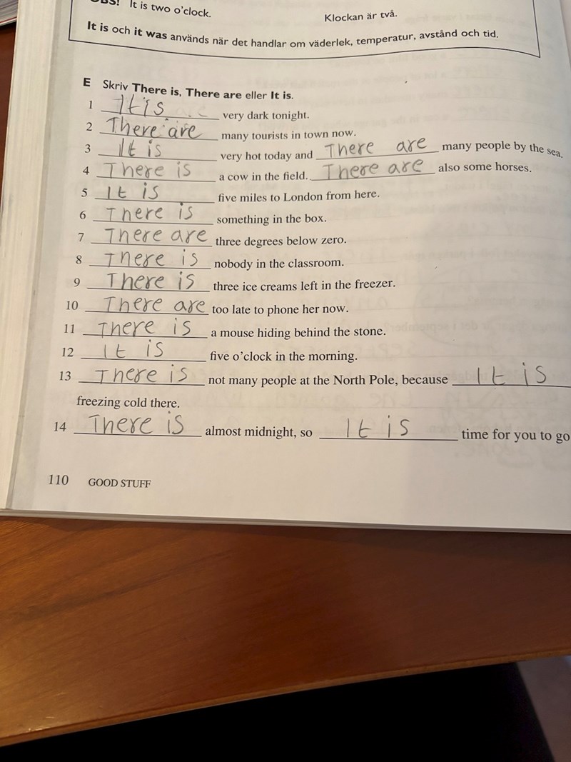 På uppgift 6, ”there are three degrees below zero” blir på svenska ”det finns tre grader under noll”
