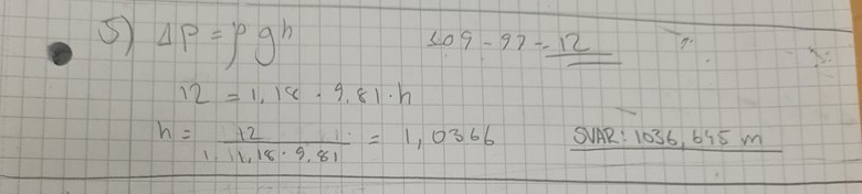Under en vandring i fjällen noteras först ett lufttryck på 109 kPa, varpå detta sjunker till 97 kPa efter att en fjälltopp bestigits. Hur många höjdmeter avverkades under bestigningen? Anta att luftens densitet i medeltal är 1,18 kg/m3.