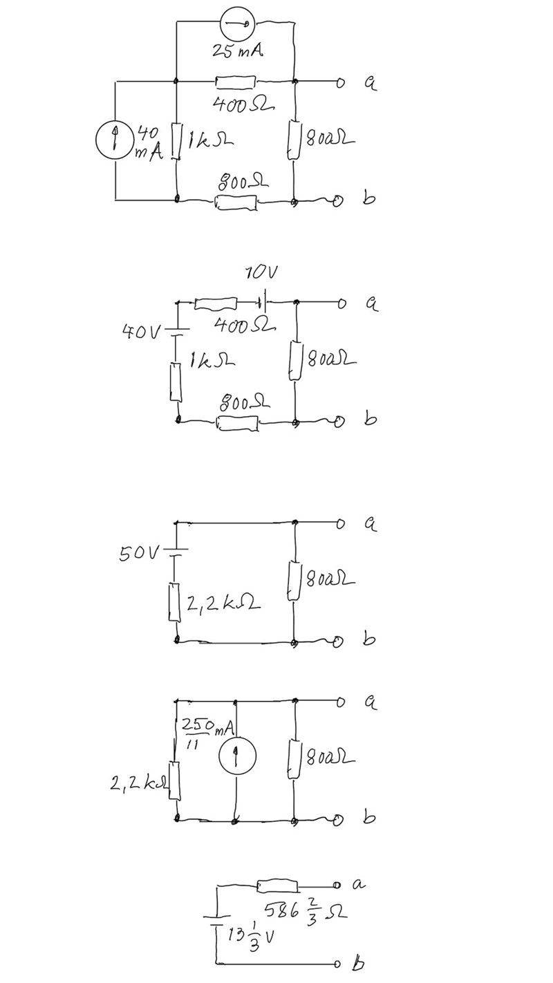 Lösningen (efter flera Thevenin-Norton omvandlingar):