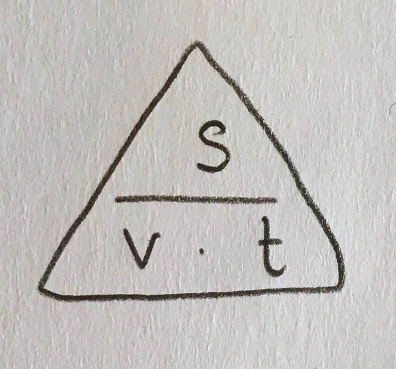 Du vet s och v och behöver beräkna t. Håll för t i svt-triangeln!