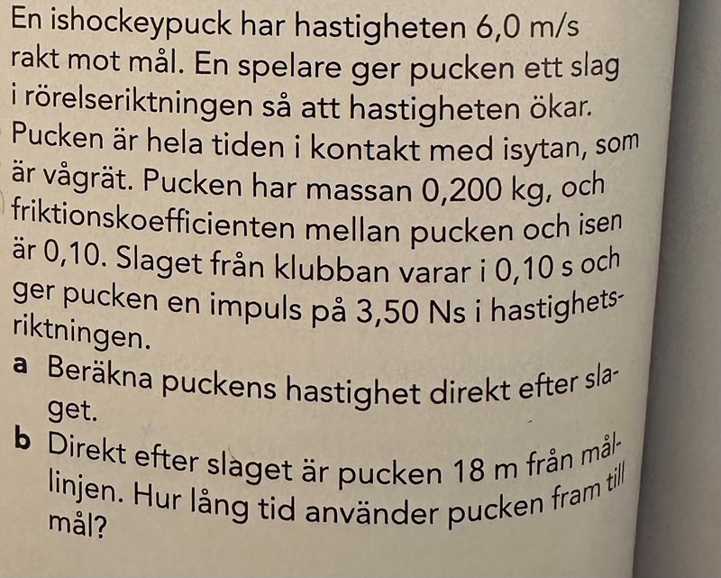 Vad är det du gör för att ta fram friktionskraften på pucken? Jag förstår inte vad det är för siffror du använder, eller vilken formel. Puckens massa är ju 200 g och friktionstalet 0,10. Friktionskraften = friktionstalet . normalkraften.