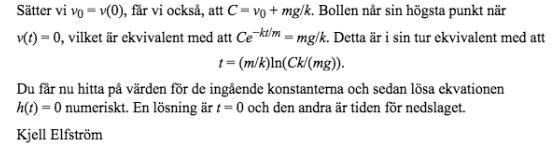3) Formulera själv lämpliga begynnelsevillkor och värden på de ingående konstanterna. Lös därefter differentialekvationen och beräkna den tid det tar för bollen att nå sin högsta punkt respektive den tid det tar för bollen att från den högsta punkten åter nå sin utgångspunkt.