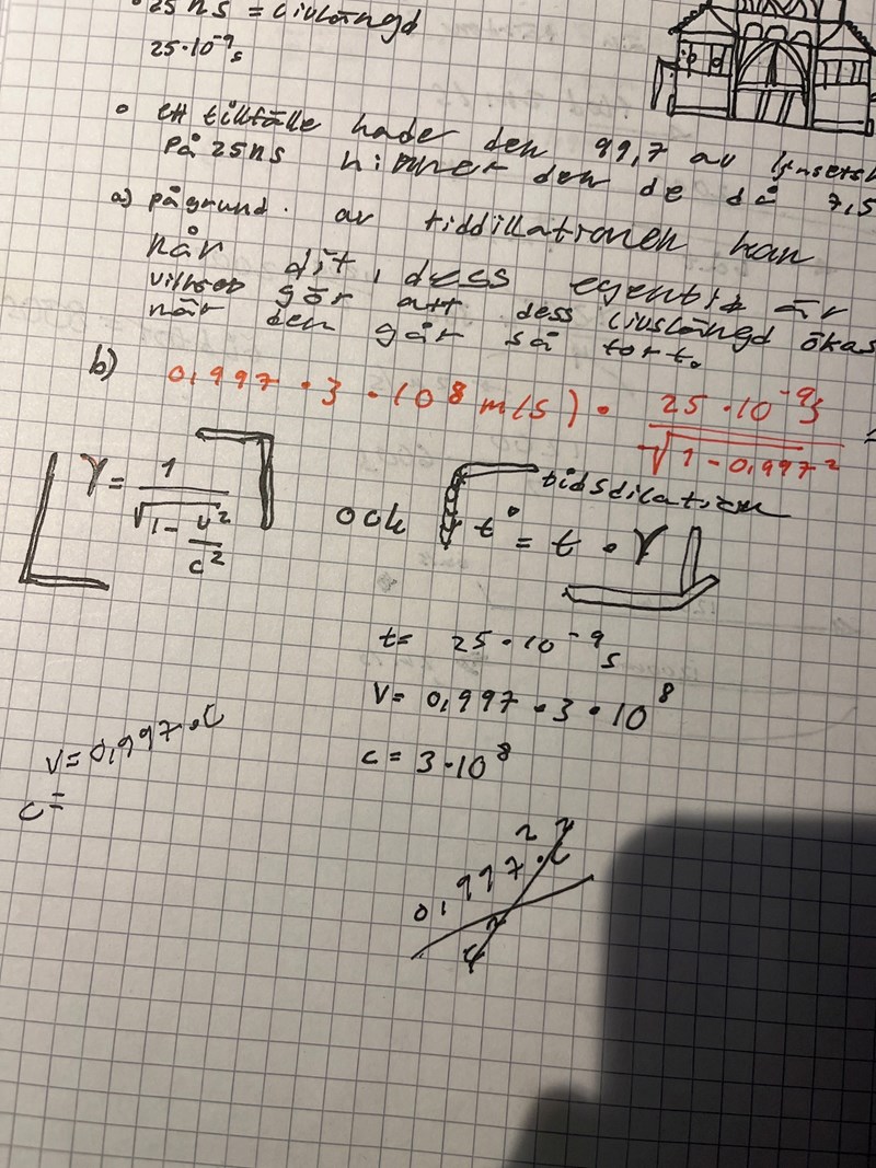 Varför står hastigheten framför allt? Ska de inte bara stå 25* 10^-9/ roten ur 1- 0,977^2?