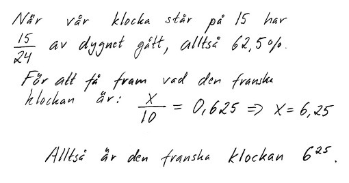 b) Vilken tid visar den franska klockan då den ”vanliga” klockan