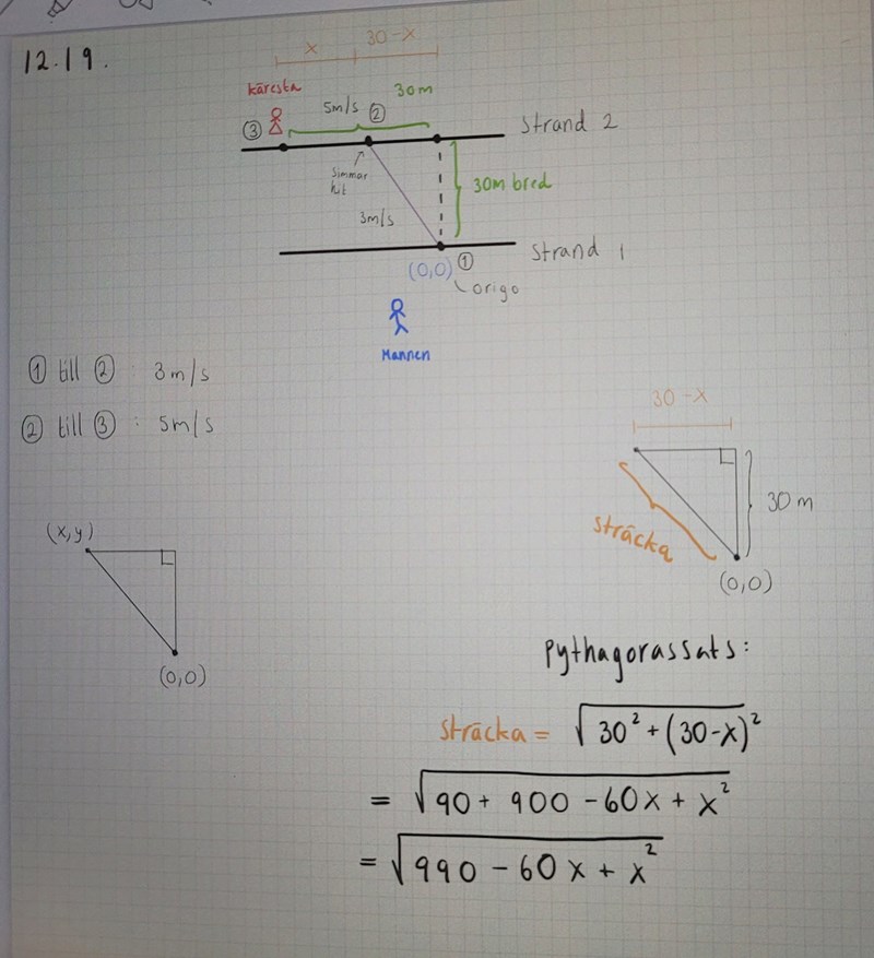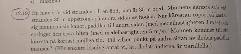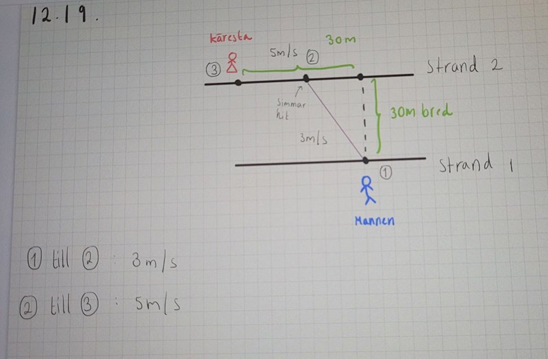 Ur detta får man fram att mannen ror till en punkt 7,5 meter från kärsten (ej avrundat eftersom tanv = 3/4).